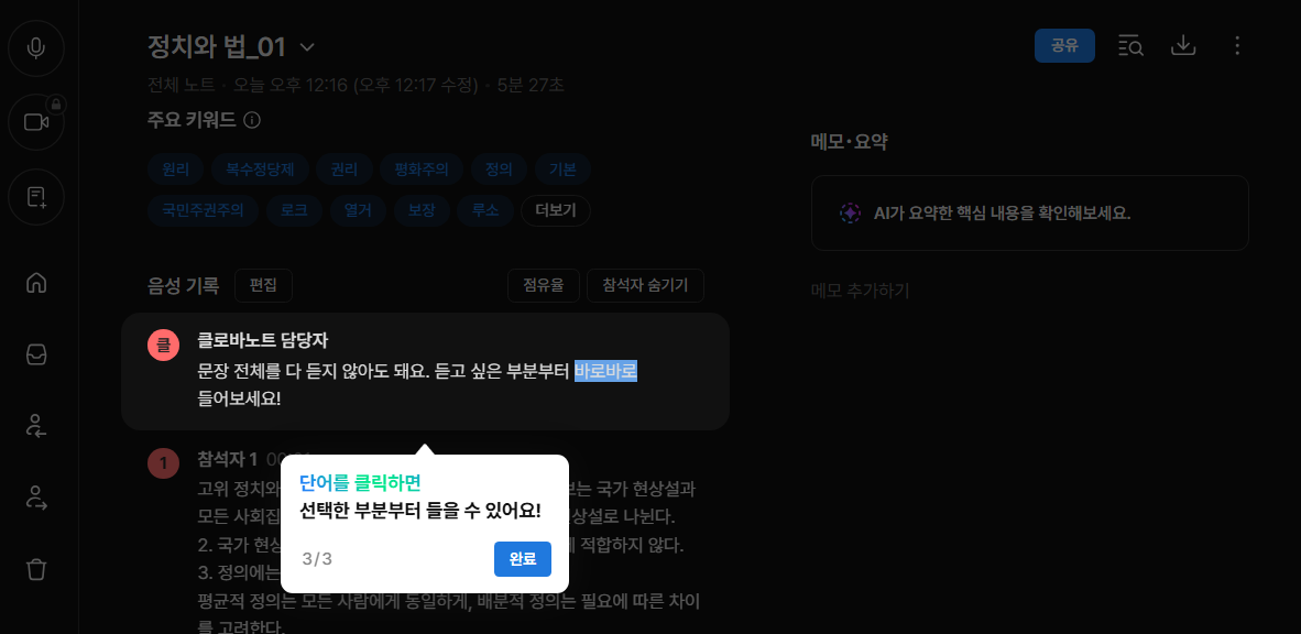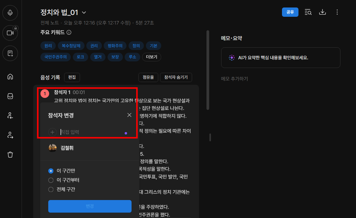 ⑥ 텍스트·음성 동시 확인문장이 이상하다 싶으면 그 부분을 클릭—바로 해당 음성이 재생돼서 맞춤교정이 쉬워요. 화자 이름도 ‘참석자 1’ 대신 실제 이름으로 바꿀 수 있답니다.![]() |