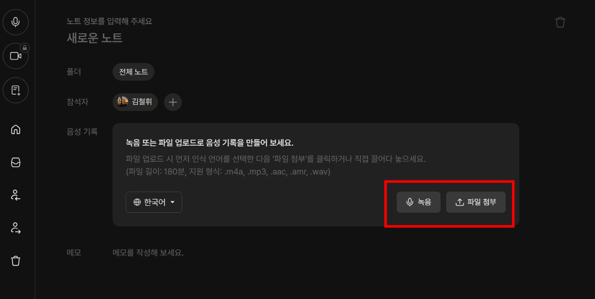 ③ 파일 첨부미리 녹음한 음성을 올리려면 <파일 첨부> 클릭.m4a·mp3·aac·amr·wav 모두 OK, 최대 180분짜리까지 지원!TIP 영어 파일이면 이 화면에서 언어를 영어로 바꿔 주세요.![]() |