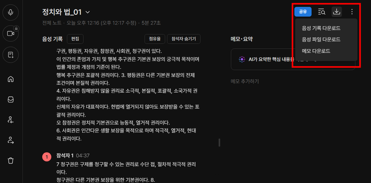 ⑧ 다운로드완성된 텍스트는 ‘다운로드 → 음성 기록 다운로드’ 선택. 시간 표시·화자 표시·하이라이트 포함 여부도 원하는 대로 설정해 저장하세요.![]() |