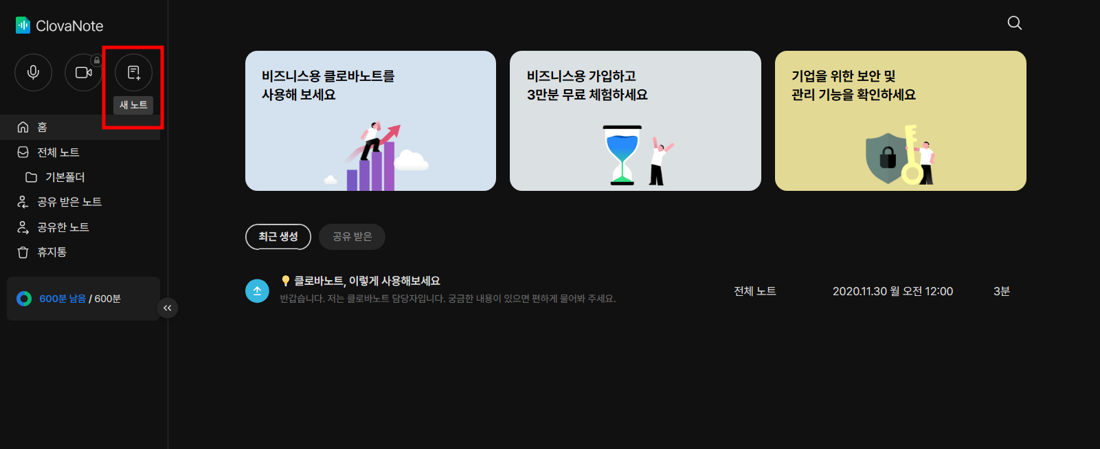 ② 새 노트 만들기왼쪽 위 ‘새 노트’ 클릭! 실시간 녹음을 하려면 ‘녹음’ 버튼을 누르면 돼요.![]() |