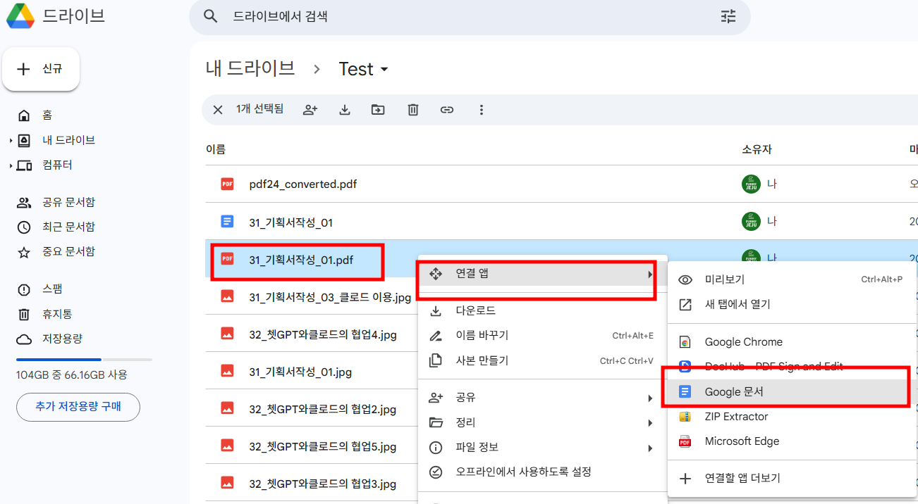 2. 업로드된 파일을 마우스 오른쪽 버튼으로 클릭하고, 연결 앱 > Google Docs를 선택해요.