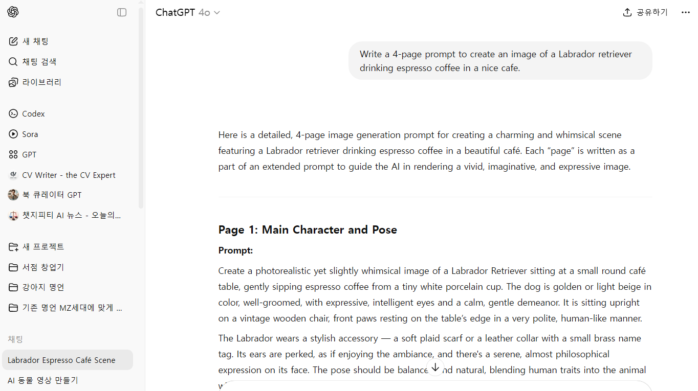 "분위기 좋은 카페에서 에스프레소 커피를 마시고 있는 래브라도 리트리버의 이미지를 만들기 위한 프롬프트를 4장 분량으로 작성해줘."