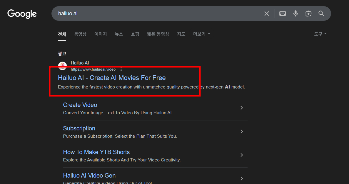 검색페이지에서 ‘하일로우(hailuo ai)’ 사이트를 검색하고 클릭하세요.