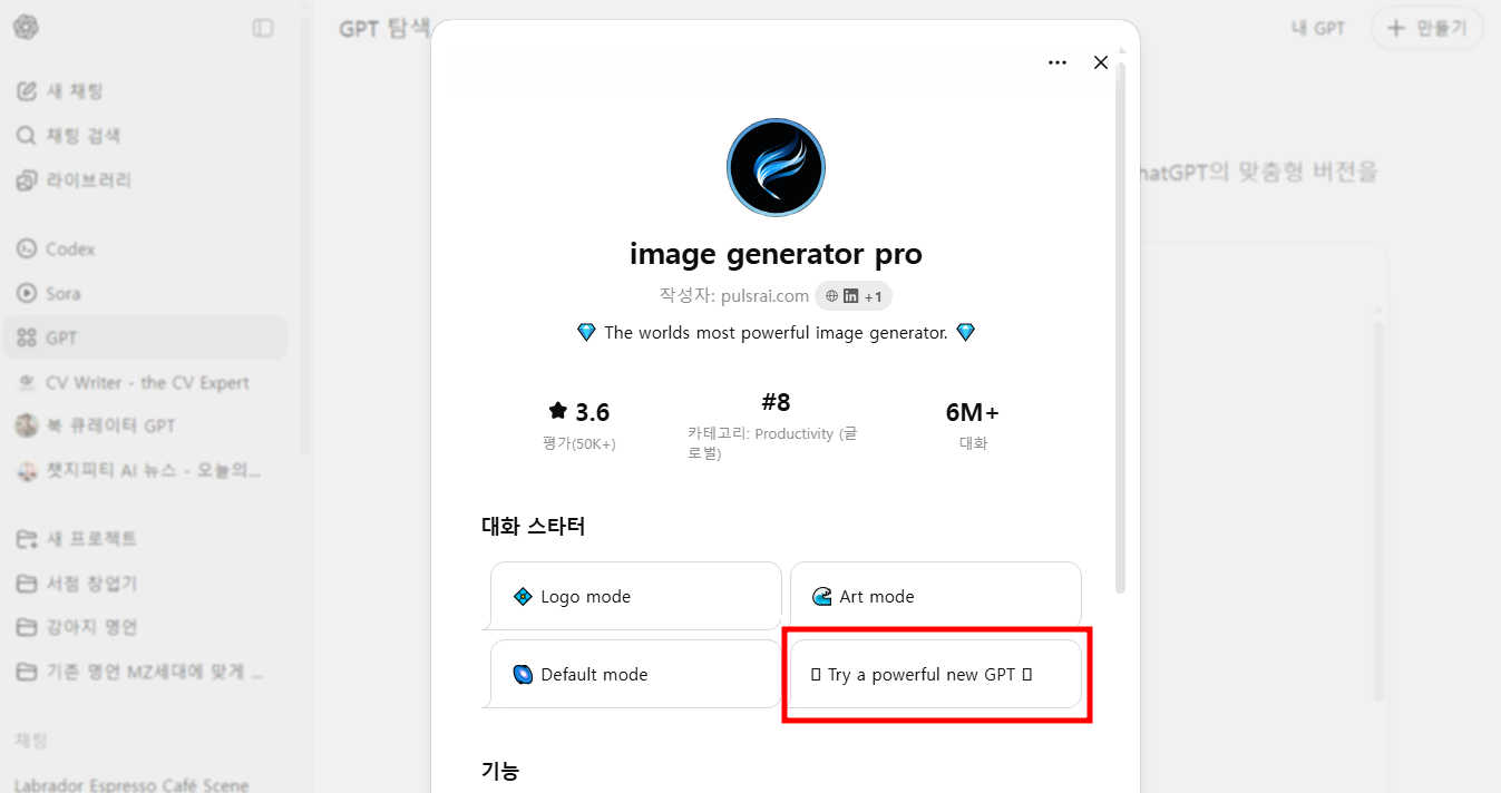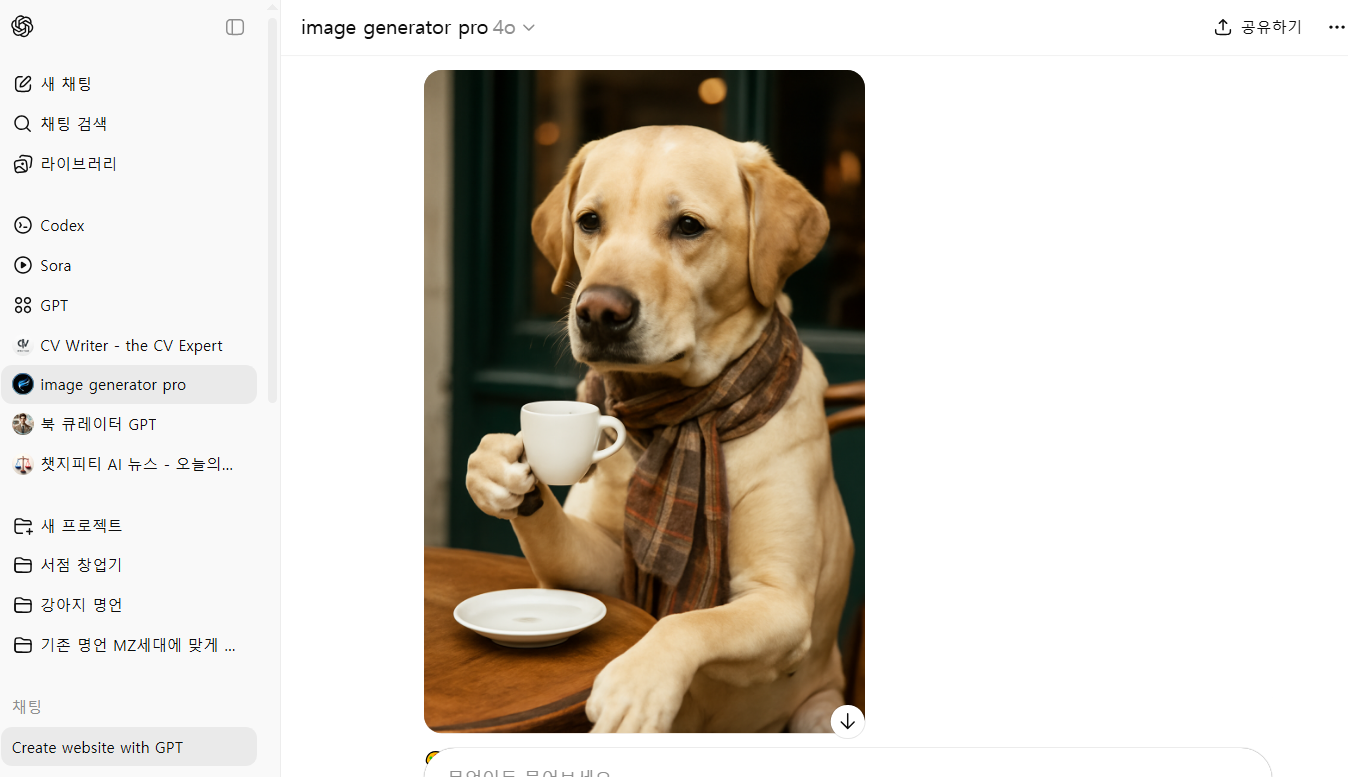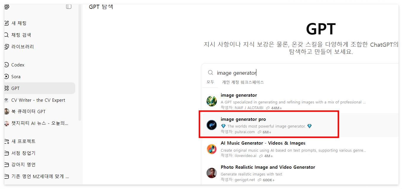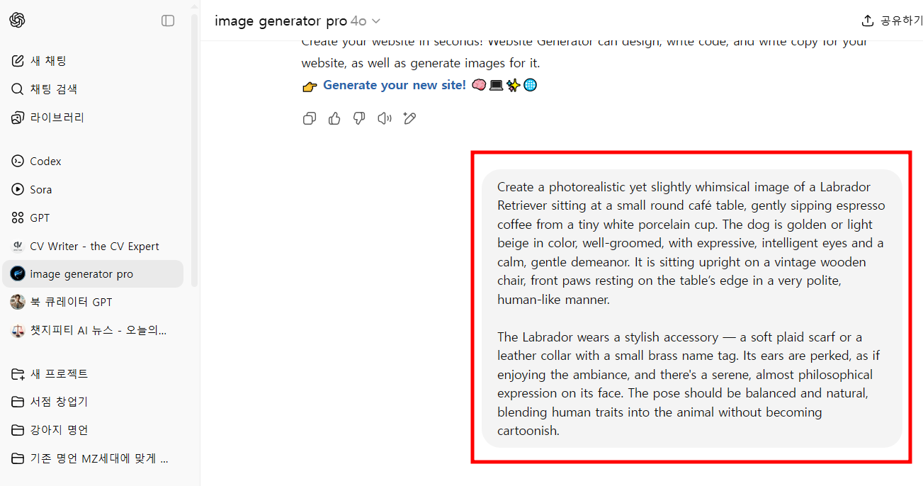 프롬프트가 생성되었다면 이제 챗GPT의 GPT 메뉴에서 '이미지 제너레이터 프로’를 선택해 주세요.