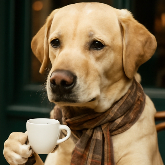 "Make a Labrador retriever slowly lift his coffee cup, put it down again and smile happily."