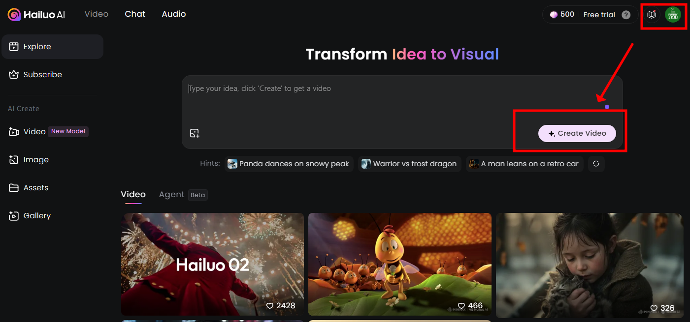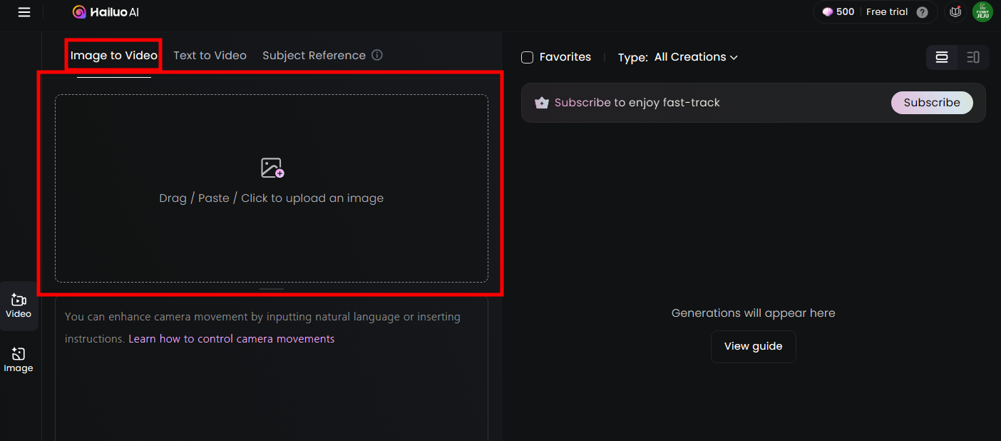 로그인한 뒤, Create Video 를 클릭하고 방금 만든 이미지를 불러옵니다.