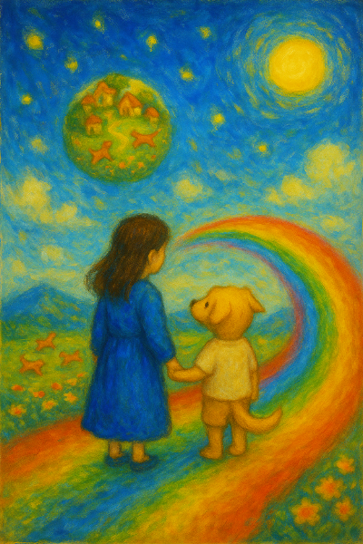 하린이 눈을 비비며 다시 보려는 순간, 무지개다리가 끝났다. 발밑에 푹신한 풀밭이 느껴졌다. 하린은 강아지별에 도착한 것이다.