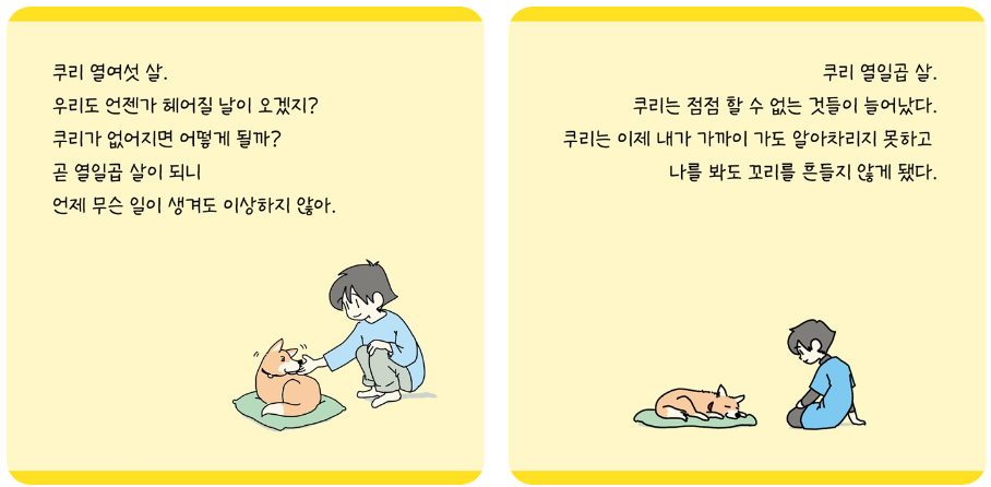 산책도, 짖는 것도, 밥을 먹는 것도 ‘하지 않게 된’ 쿠리. 하지만 여전히 귀엽고, 사랑스럽고, 행복하다는 말에 저는 위로를 받았습니다. 나이 들어가며 하나씩 내려놓게 되는 것들 속에서도, 우리 존재는 그 자체로 존중받고 사랑받아야 하니까요.